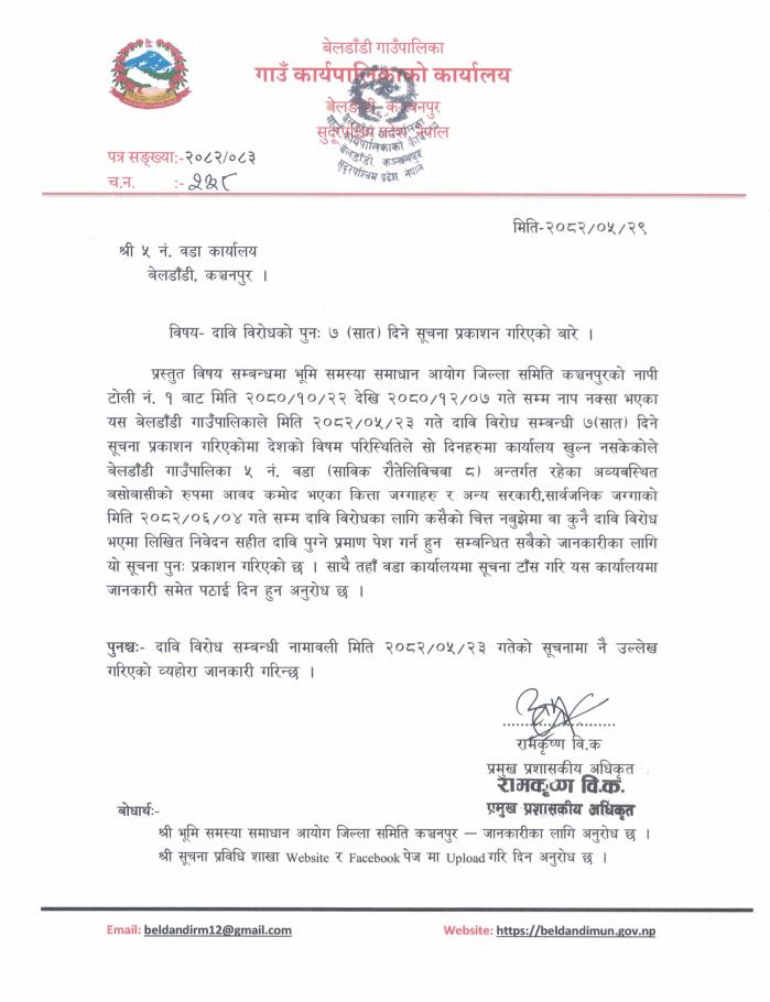 दाबि बिरोधको पुनः ७ दिने सूचना प्रकाशन गरिएको बारे ।