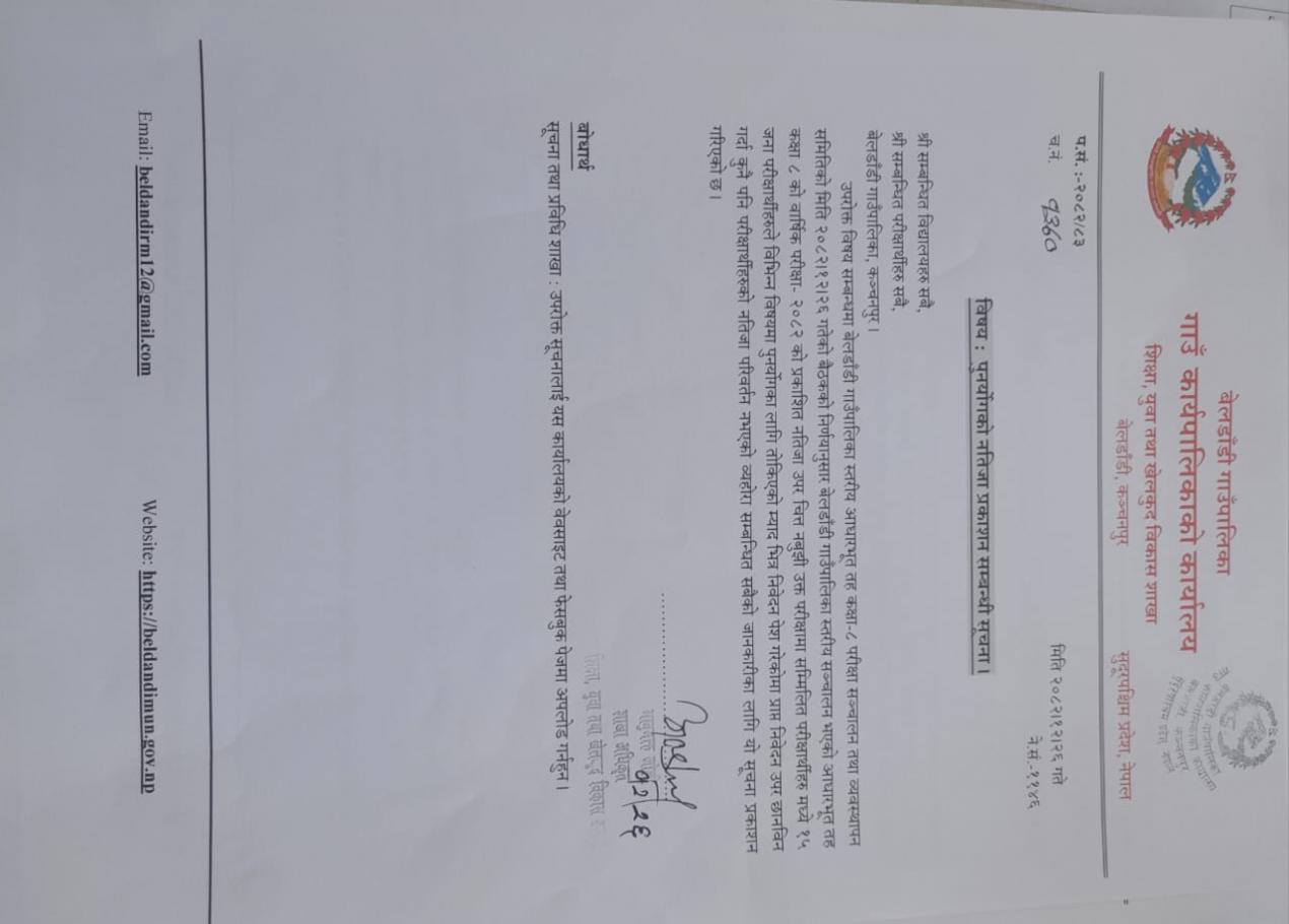 शैक्षिक सत्र २०८२ को आधारभूत तह कक्षा ८ को नतिजा उपर पुनर्योग सम्बन्धी सूचना ।