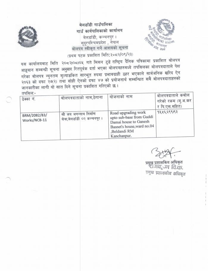 बोलपत्र स्विकृत गर्ने आषयको सूचना ।