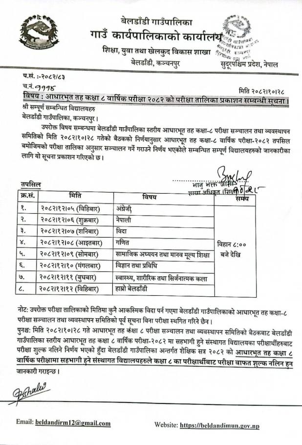 » आधारभूत तह कक्षा ८ बार्षिक परीक्षा २०८२ को परीक्षा तालिका प्रकाशन सम्बन्धी सूचना ।