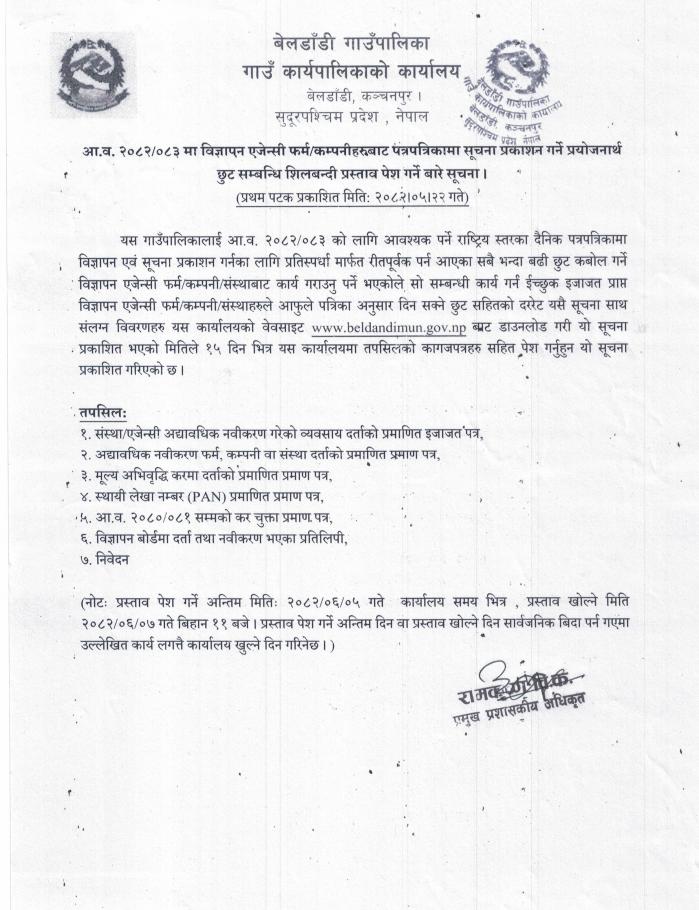 आ.ब. २०८२/०८३ मा विज्ञापन एजेन्सी /फर्म /कम्पनीहरुबाट पत्रपत्रिकाहरुमा सूचना प्रकाशन गर्ने प्रोजनार्थ छुट सम्बन्धि शिल बन्दी प्रस्ताव पेश गर्ने सम्बन्धि सूचना ।