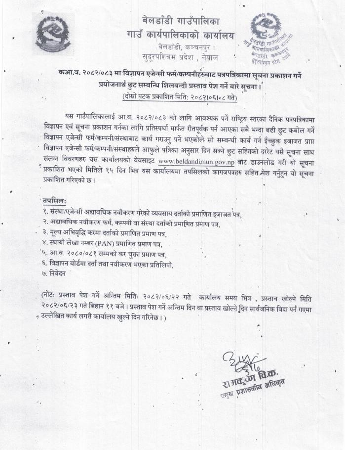 आ.ब. २०८२/०८३ मा विज्ञापन एजेन्सी /फर्म /कम्पनीहरुबाट पत्रपत्रिकाहरुमा सूचना प्रकाशन गर्ने प्रोजनार्थ छुट सम्बन्धि शिल बन्दी प्रस्ताव पेश गर्ने सम्बन्धि दोस्रो पटक प्रकाशित सूचना । ।