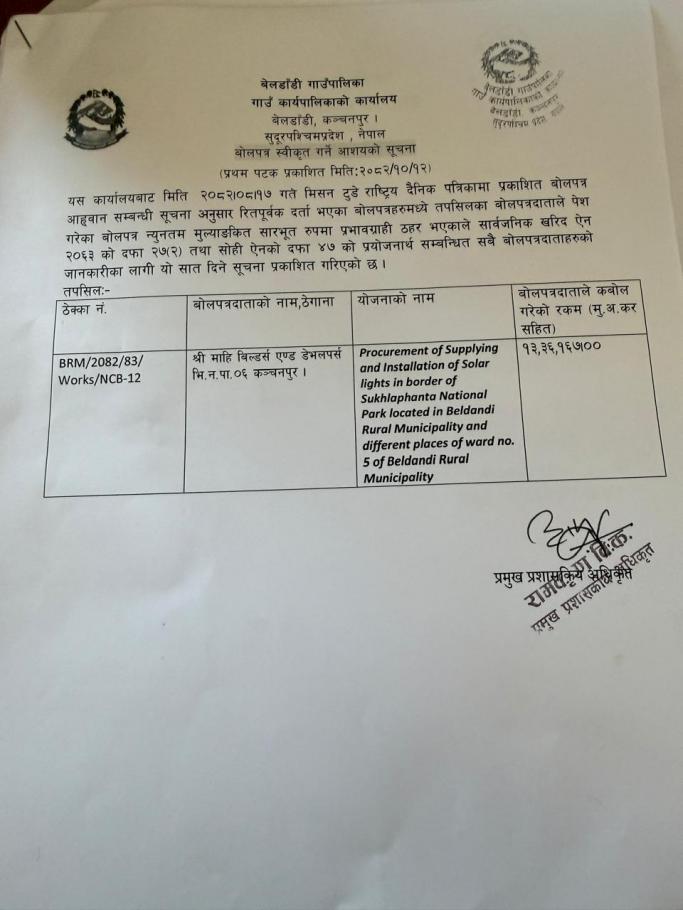 बोलपत्र स्विकृत गर्ने आशयको सूचना ।