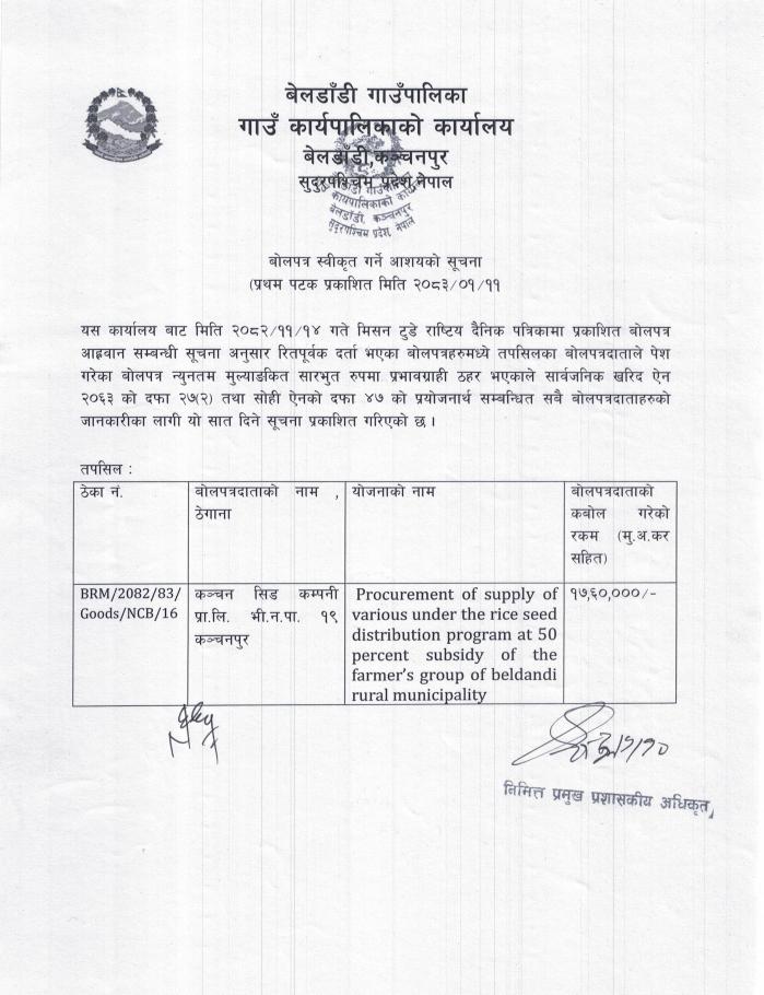 बोलपत्र स्विकृत गर्ने आशयको सूचना ।