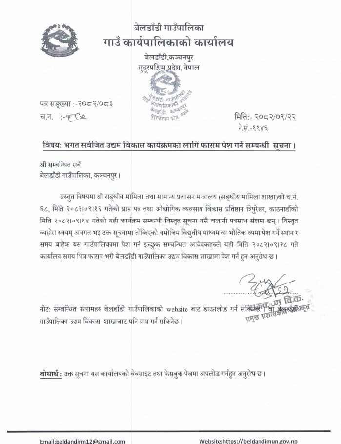 भगत सर्वजित उद्यम विकास कार्यक्रमका लागि फारम पेश गर्ने सम्बन्धी सूचना ।
