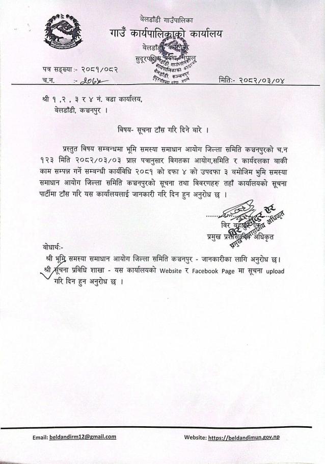 भुमि समस्या समाधान आयोग जिल्ला समिति कञ्चनपुरको दाबि बिरोध सम्बन्धी ७ दिने सूचना प्रकाशित गरिएको बारे ।
