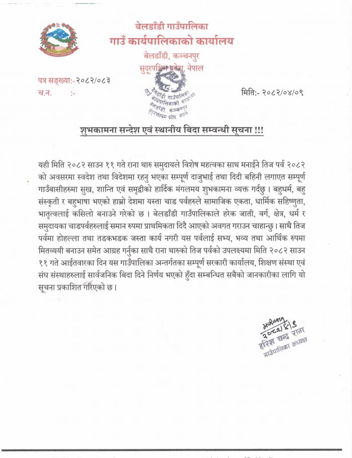 शुभकामना सन्देश तथा स्थानिय बिदा सम्बन्धी सूचना ।