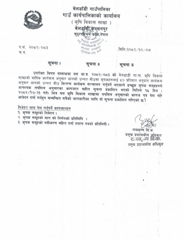 शित भण्डार (Cold Store)मा कृषिजन्य उत्पादनको भण्डारण, वितरण तथा कारोबार गर्न निवेदन पेश गर्ने सम्बन्धी दोस्रो पटक प्रकाशित सूचना । ।